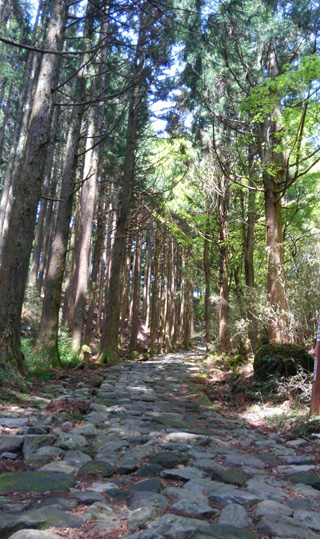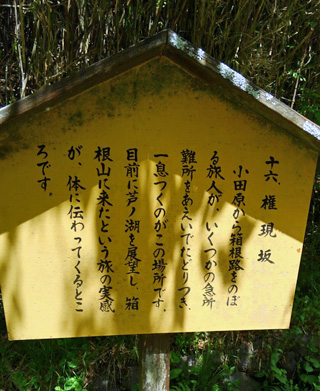 バス停甘酒茶屋で降りて、その(江戸初期創業)の裏から入り、箱根旧街道へバス道を渡る。二子山の南側に、正面に二子山が見える所がある。権現坂を経て芦ノ湖畔まで歩く。所々、往時の石畳が保存整備されていて、趣がある。