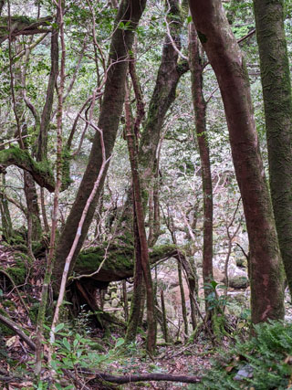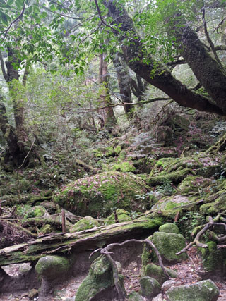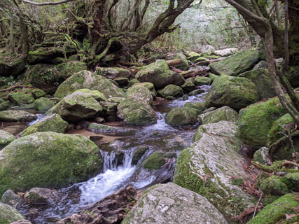 屋久杉が生える、苔むす森を、白谷川沿いに歩く。