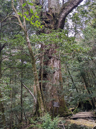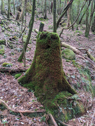 切り株更新;江戸時代に切られた杉の株の上に、新しく杉が生えた。根がまがりくねって生えている。