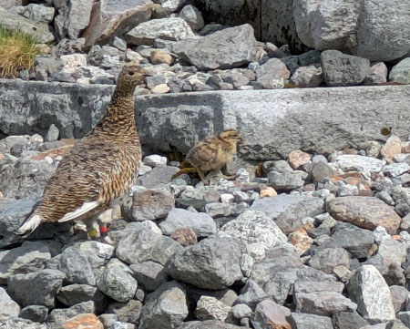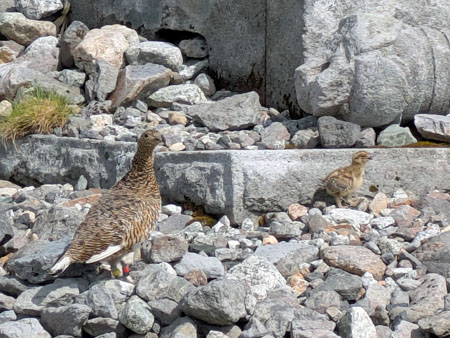 ホテルからすぐそばの場所で、ライチョウの親子と遭遇! ヒナを3匹連れていた。