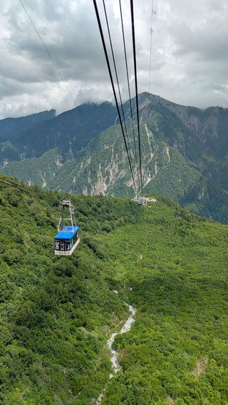 立山ロープウェイ;日本最長1700m。ワンスパンロープウェイ(支柱がない・・雪崩が多いため、支柱が流されてしまうので。)